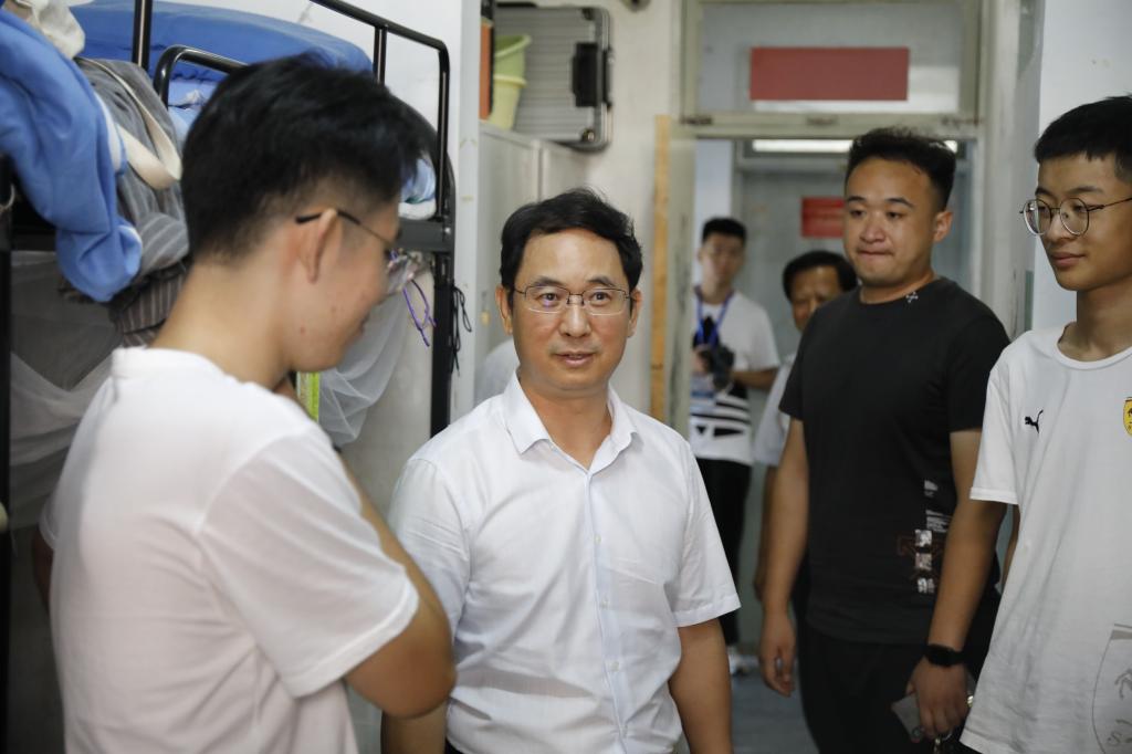 在迎新现场,于光辉院长依次走访了新生报到处、学生公寓、学院食堂,了解新生入校后的生活情况。特别到访学院新增的机器人工程专业迎新点,询问报道情况;到学生公寓实地查看新生的住宿条件、生活设施,了解新生的住宿需求;与食堂工作人员进行交流,叮嘱他们饭菜价格要合理,并根据季节变化调整饭菜种类,体现了学院对学生身体健康的高度重视。于光辉院长还对当前疫情的防控做了缜密安排,他要求学院防控不仅体现在新生通知书里,还要对新生进行一一交代,并且要对宿舍、食堂进行严格杀菌消毒,为新生安全做好充分准备;他指出,学院还会通过网站、新生入学教育等各种方式来帮助新生适应大学生活。最后,于光辉院长勉励新生要珍惜时间、积蓄能量、奋力拼搏,做一些有意义的事情,好好度过自己的大学生活。