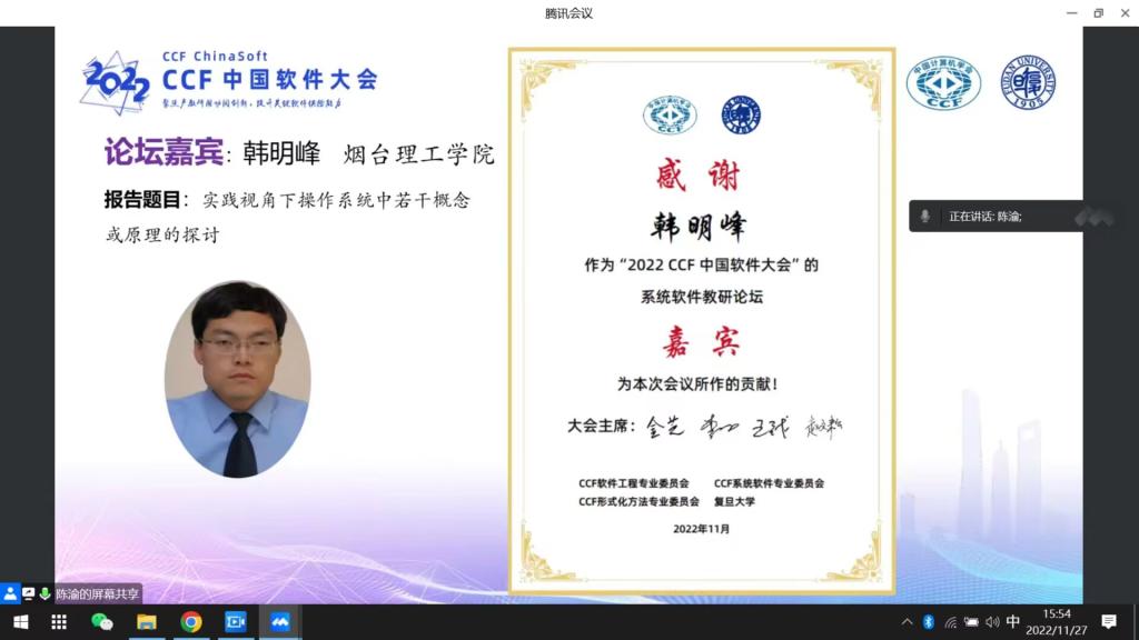 11月25-27日,2022 CCFChinaSoft大会在线上召开,本次大会的主题是“聚焦产教研用协同创新,提升关键软件供给能力”。大会主席、中国计算机学会(CCF)软件工程专业委员会主任、南京大学教授李宣东主持大会开幕式。我校信息工程学院韩明峰教授受邀在系统软件教育论坛上作“实践视角下操作系统中若干概念或原理的探讨”专题报告,他提出通过操作系统实践和操作系统实例推进操作系统教材的进步,深入分析科目408的命题导向,并分享了自己的思考与实践,受到CCF教育工委主任、教育部软件工程教学指导委员会副秘书长、上海交通大学软件学院院长臧斌宇教授等与会专家的充分认可和广泛好评。