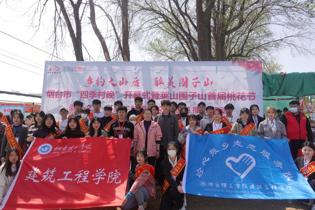 4月15日,由烟台市“四季村晚”开幕式暨莱山围子山首届桃花节在解甲庄街道大山后村拉开帷幕,烟台理工学院建筑工程学院师生和“砼心振乡”志愿者服务队100余名大学生志愿者积极投入其中,发挥高校优势,为乡村振兴注入青春力量。